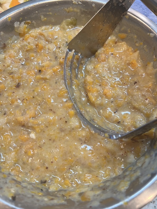 人参、さつまいも、じゃがいも、キャベツ、豆乳、サワラ、発芽玄米、菊芋パウダーなどを今回は圧力鍋で煮て潰しました。