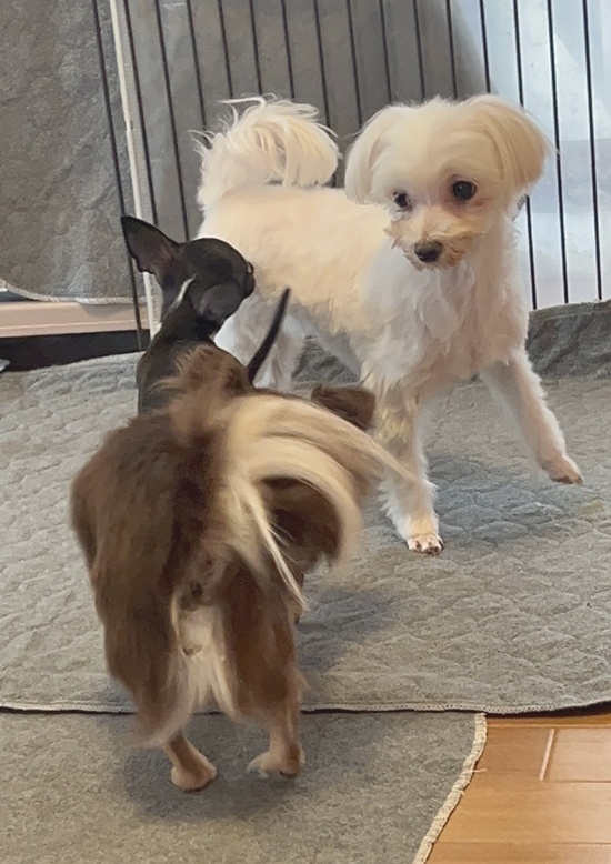 子犬はよじ登ってくる、大人わんこは飛びついてくる、撫でて、かまってと皆やってくる・・を2本の手でかわしながら、お坊ちゃまの終了を待ってるわけです。