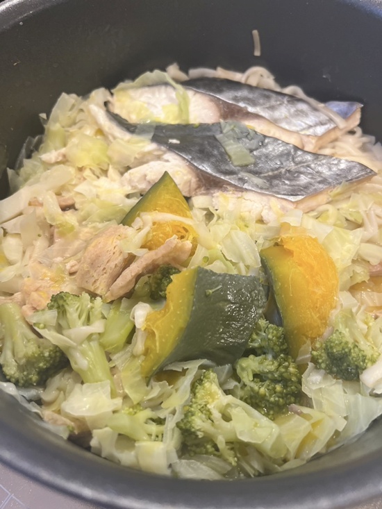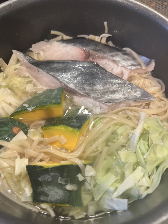 サワラにキャベツ、大豆ミート、かぼちゃ、ブロッコリーうどんの茹で麺(昨日少し残っていたので)