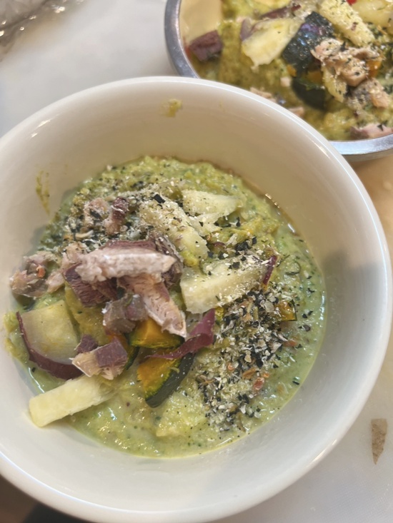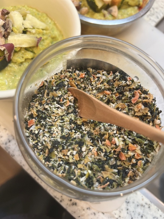 トッピングにブリ、さつまいも、かぼちゃ、発酵野菜のふりかけをパラパラと
