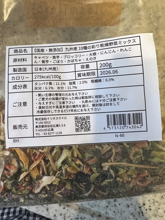 袋は捨ててしまいましたが、先程の乾燥野菜と同じくイリオスマイルのものです。