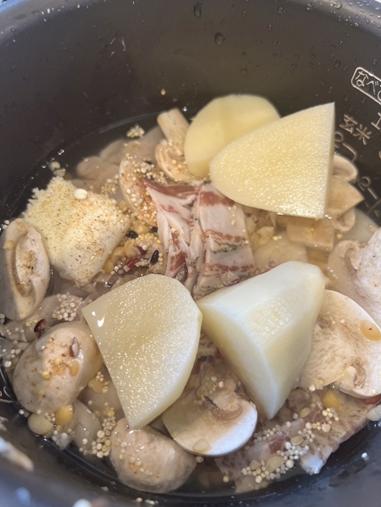 野菜やベーコン、鶏肉、カレー粉を入れてスイッチオンのみ。