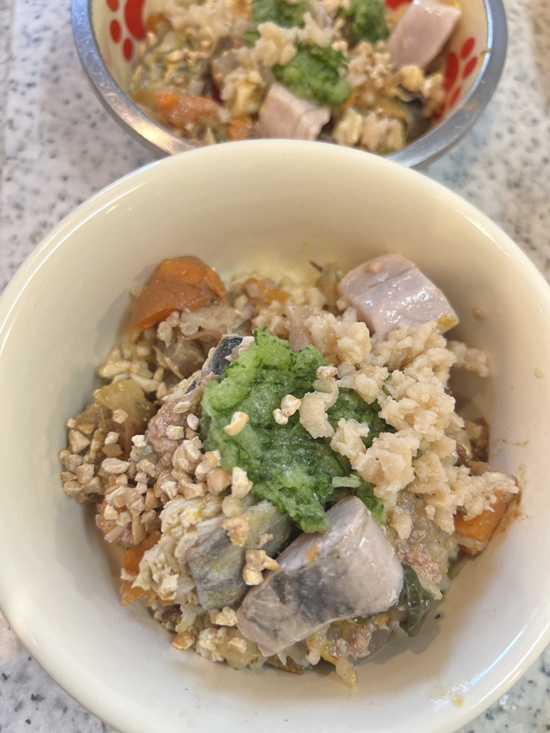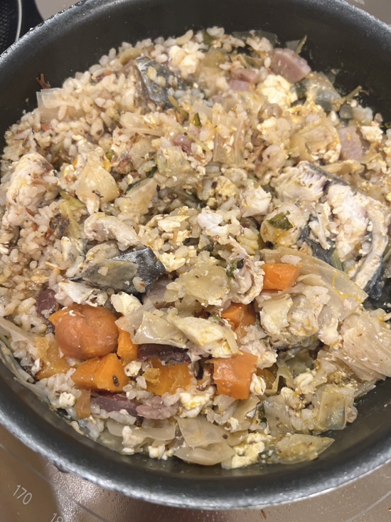 下は煮込んでいる時ですが、サワラ、キャベツ、人参、ご飯、鰹節・・とシンプル。