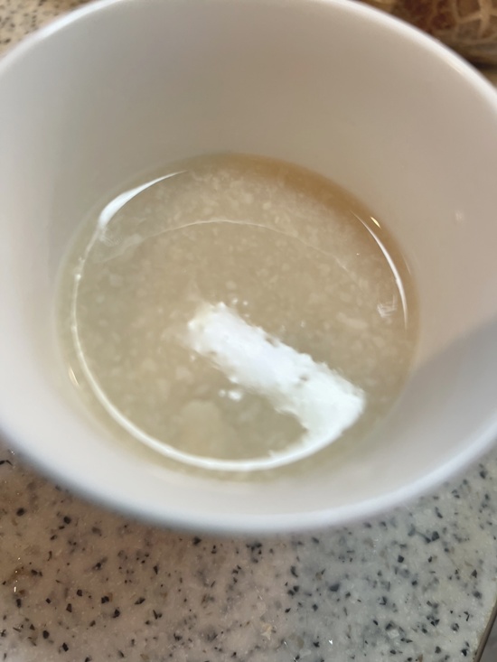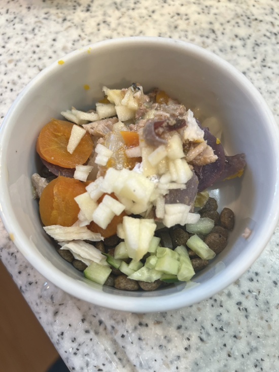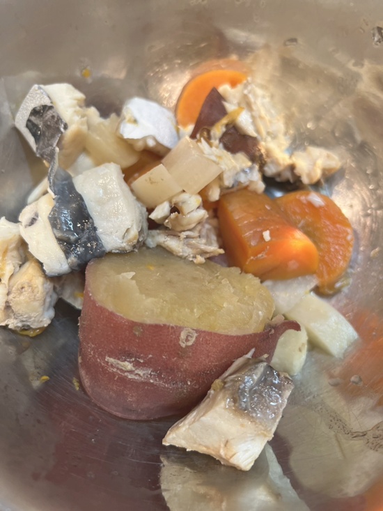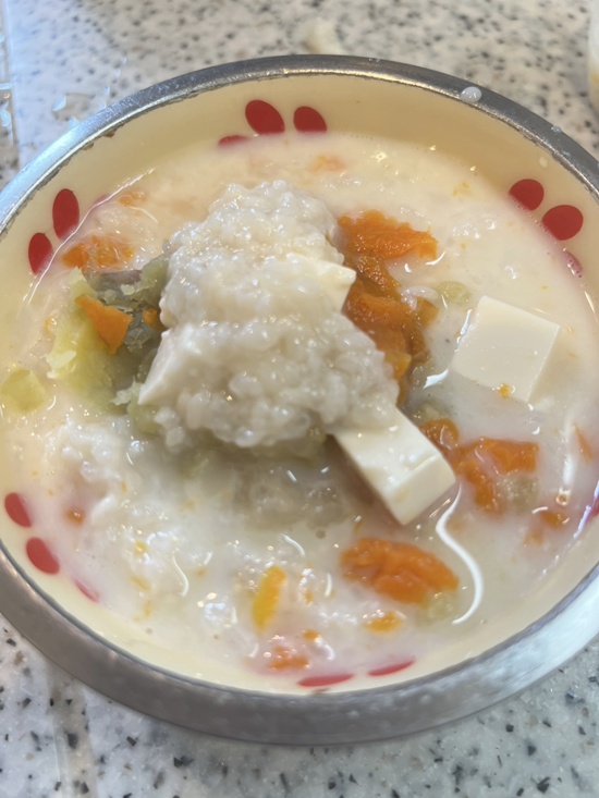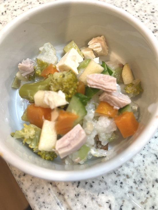 これはカヌレの分です。松濤よりはお腹がよろしくないので、緩めの豆乳粥(サワラ入)、潰した野菜、豆腐、同じく甘酒たっぷり入れました。