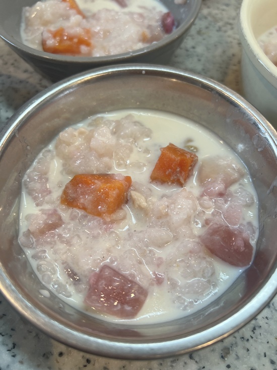 野菜(人参と紫大根)と一緒に柔らかめに炊いたご飯に熱い内に豆乳。