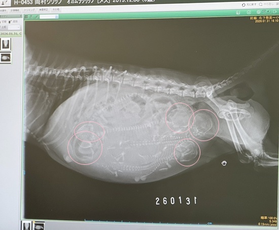 血液検査で貧血、心雑(Grade3/6)、パテラ、CRP(炎症反応値)など色々でしたが、ご飯をしっかり食べ、栄養が行き届いて来たようで、ママの体もふっくら、順調にお腹の子も成長しているようです。