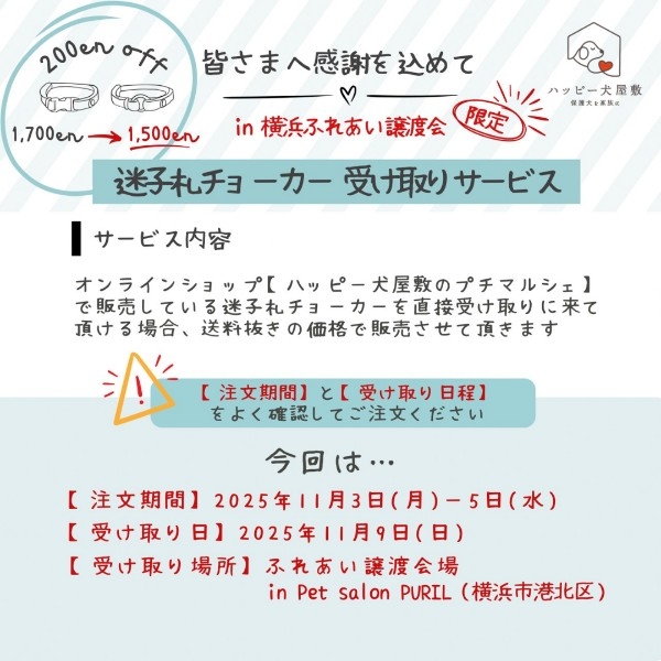 - 体調不良などで参加メンバーが変更になる場合がありますので、ハッピー犬屋敷ホームページまたは担当預かりボランティアのSNSにてご確認をお願いいたします。