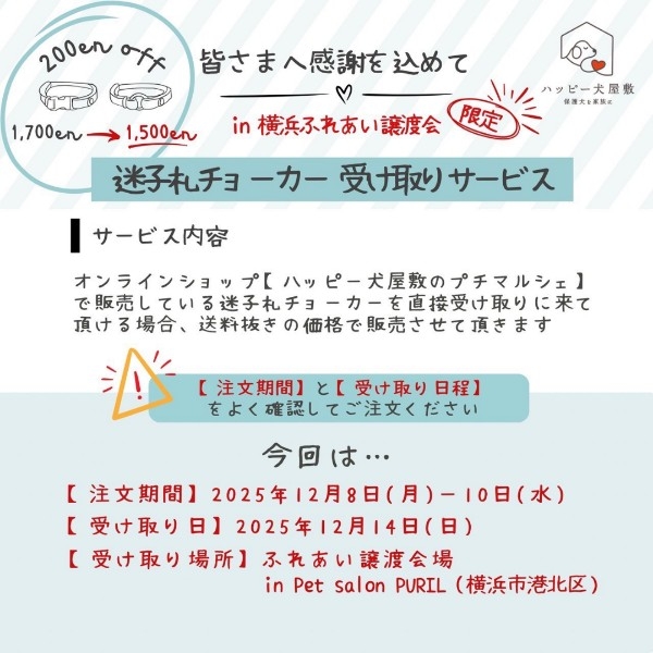 - 体調不良などで参加メンバーが変更になる場合がありますので、ハッピー犬屋敷ホームページまたは担当預かりボランティアのSNSにてご確認をお願いいたします。