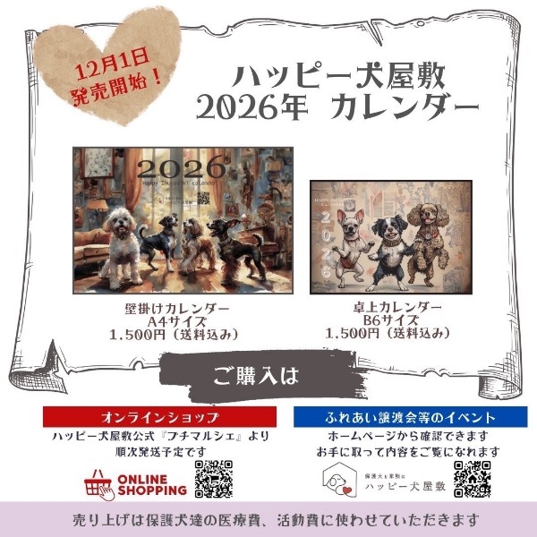 ハッピー犬屋敷2026カレンダーの販売も予定しています。