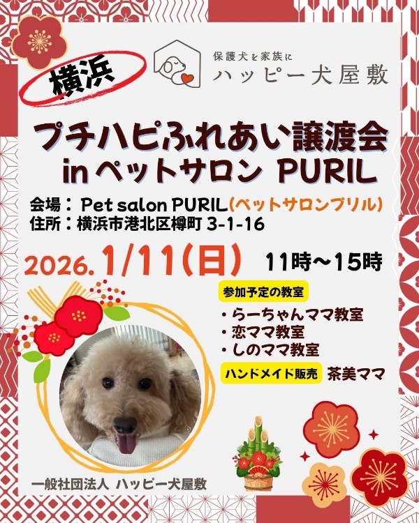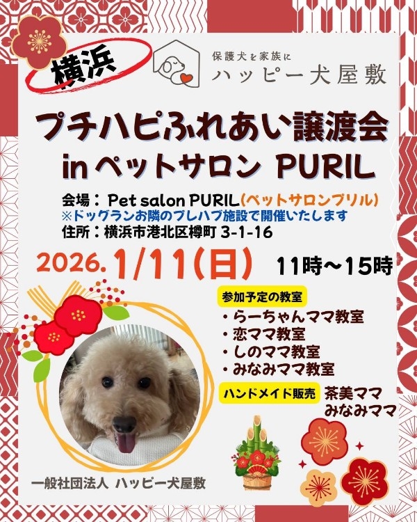 - 体調不良などで参加メンバーが変更になる場合がありますので、ハッピー犬屋敷ホームページまたは担当預かりボランティアのSNSにてご確認をお願いいたします。