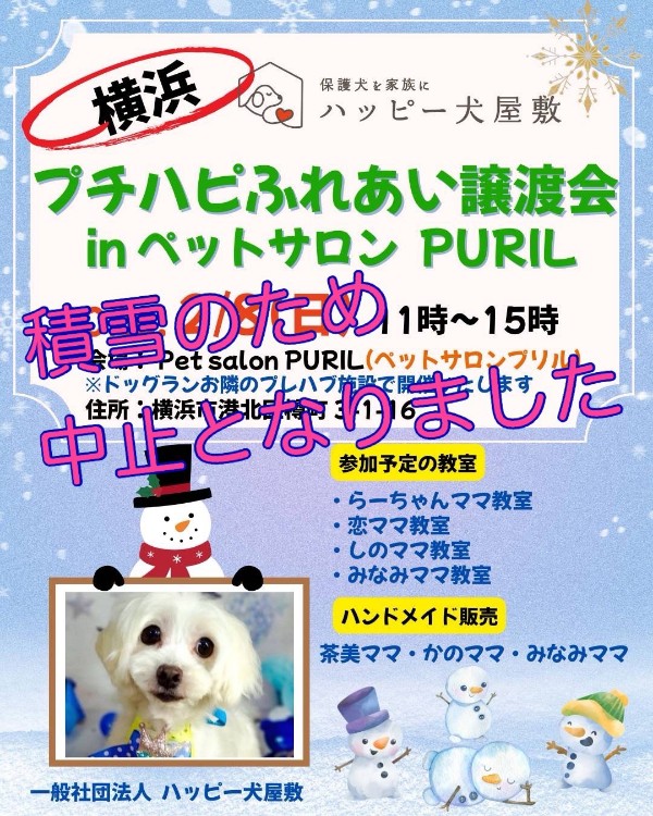 - 体調不良などで参加メンバーが変更になる場合がありますので、ハッピー犬屋敷ホームページまたは担当預かりボランティアのSNSにてご確認をお願いいたします。