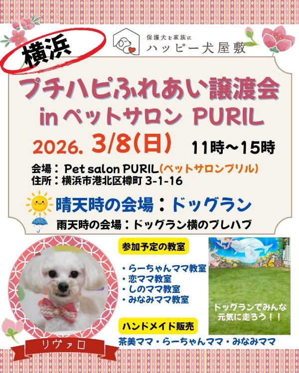 - 体調不良などで参加メンバーが変更になる場合がありますので、ハッピー犬屋敷ホームページまたは担当預かりボランティアのSNSにてご確認をお願いいたします。
